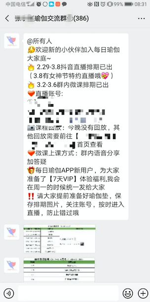 因此,在每日瑜伽这里,密集的直播和社群之间形成了紧密且强大的流量支持配合。一方面,学习群、资料以及其他福利不断吸引公域平台直播间的新用户,并且是很精准的瑜伽关注者,引导他们去进入每日瑜伽的私域社群,先持续沉淀。