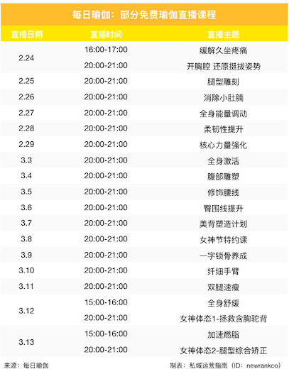 其中让“私域运营指南”印象比较深刻的是每日瑜伽在疫情期间密集进行的免费瑜伽课程直播。