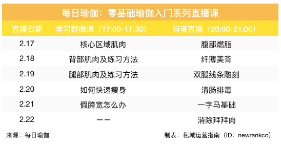 “私域运营指南”体验了多个每日瑜伽的直播课程,梳理出其在直播、引流到后续运营过程中的基本方法: