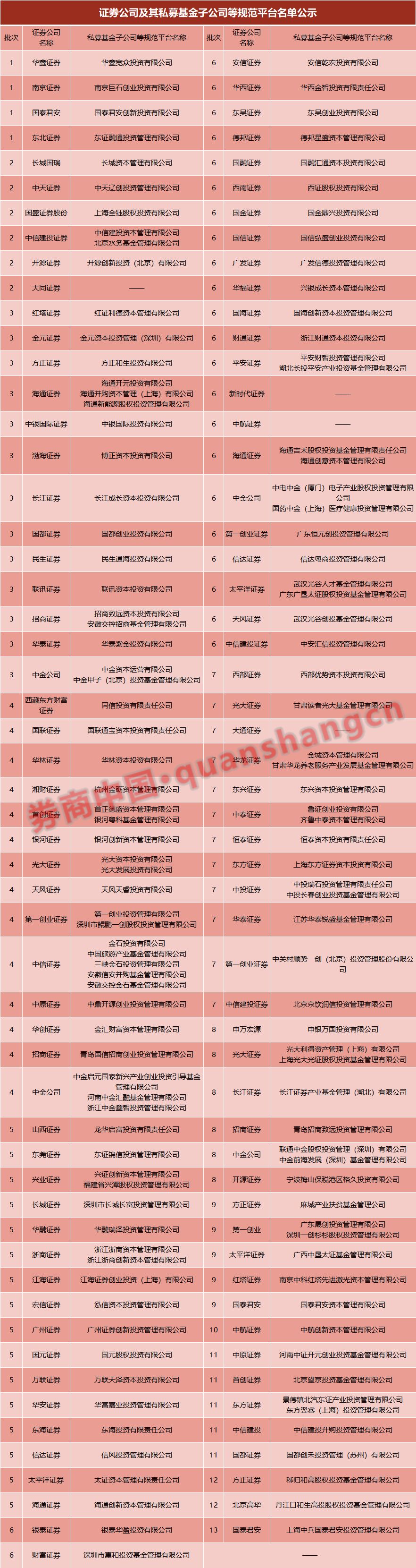 根据证券业协会网站,目前已有十三批证券公司及其私募基金子公司等规范平台名单公示。规范平台可以据此办理有关私募基金管理人登记和产品备案,并向注册地中国证监会派出机构报送已通过的整改报告。