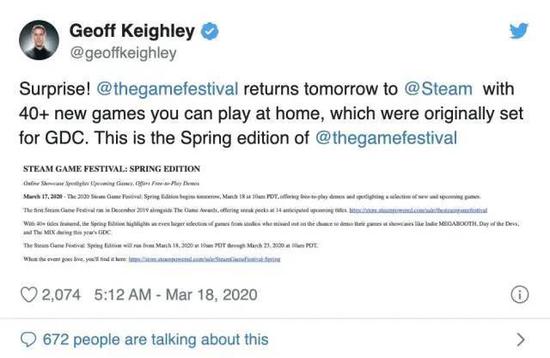 虽然,今年的游戏开发者大会(GDC 2020)受疫情影响被迫取消。但为回馈广大游戏宅一年一度的期待,TGA创始人Geoff Keighley和steam依旧合作推出了第二季steam游戏节:
