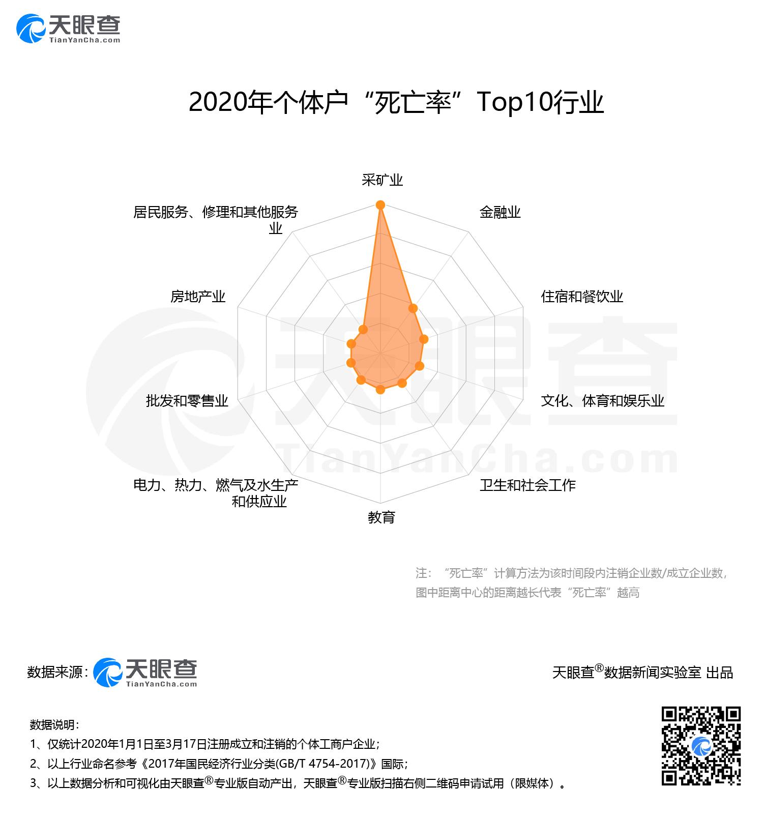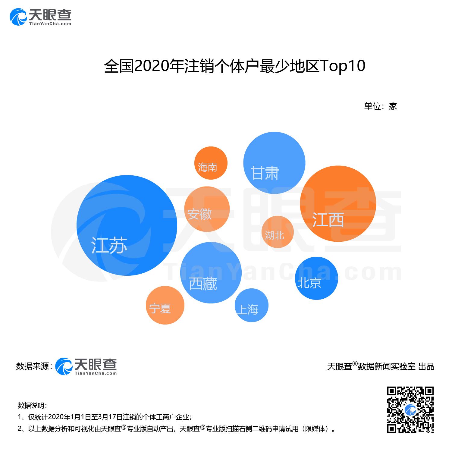 天眼查专业版数据显示,2020年1月1日至3月17日,我国企业状态显示为已注销的个体工商户仅有大约13万家,与去年同期相比数量下降明显。从地域分布上看,江苏省个体户的注销数量最少,江西省和西藏自治区位居第二三位。从行业分布上看,采矿业、金融业、住宿和餐饮业的个体户注销数与新增数相比占比较大,是个体户”死亡率“较高的前三行业。