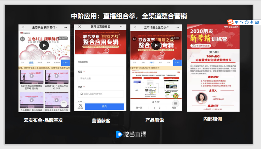“直播对外可以进行品牌营销,对内则可以实现多维度的培训降本增效,协助企业提高沟通与协同效率。特别是对于保险、金融、农业、生物科技、制造业等具有多门店、多渠道的企业来说,直播可以解决疫情期间对下属渠道、员工以及客户的培训,解决无法差旅的问题。”微赞COO刘倩说道。