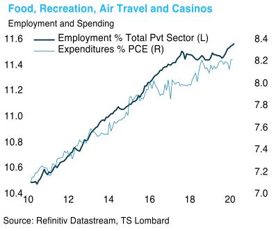在新一轮的冲击中,将会有1,200万人失业。在美国仅仅餐饮业、娱乐、航空和博彩业,就占据了私人部门就业的11.6%,同时占据了私人消费支出的8.4%。因此,这次疫情对于美国的就业冲击非常大。