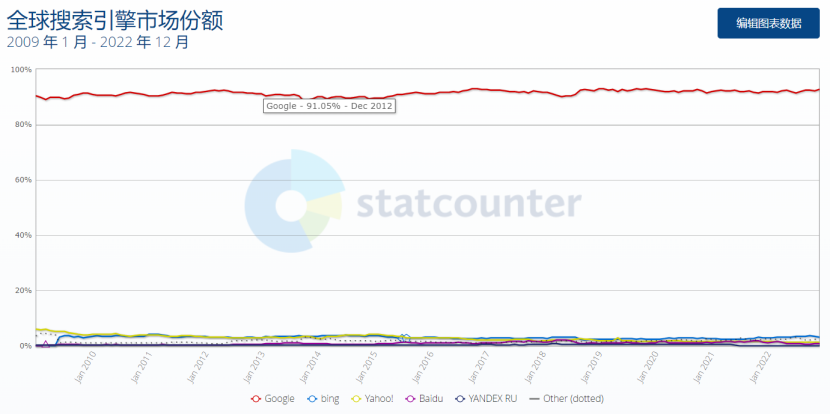 1、Google Search 在 1998 年上线,至今已经有 20 多年的时间了,在这 20 多年的时间里,谷歌一直一家独大,根据 Statcounter 的数据显示 2022 年 12 月谷歌搜索在搜索引擎市场的市占率达到 92.58%,并且从下图可以看出,多年以来谷歌对其他几个竞对都是压倒性的优势。而这背后很大的原因是,搜索引擎这种嫁接两端(用户搜索需求-内容供给)的模式是有规模效应的,在技术没有变革的情况下,很难有后来者赶超。