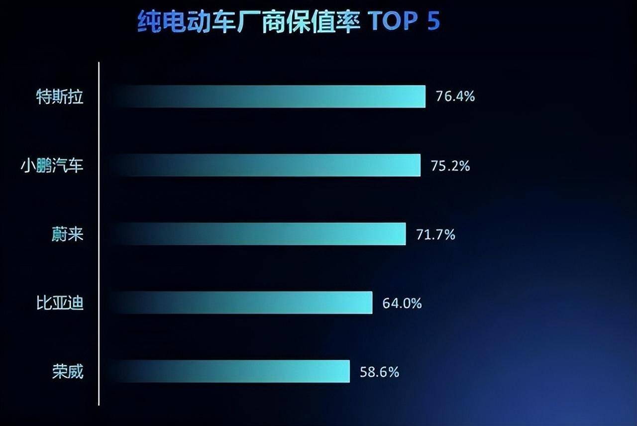 2022年纯电动车的保值率首度被纳入研究范畴。值得注意的是不同于燃油车统计的是三年保值率,纯电动车统计的是一年保值率。以一年保值率为标准,第一位是特斯拉,其他四位分位是小鹏汽车、蔚来、比亚迪、荣威。