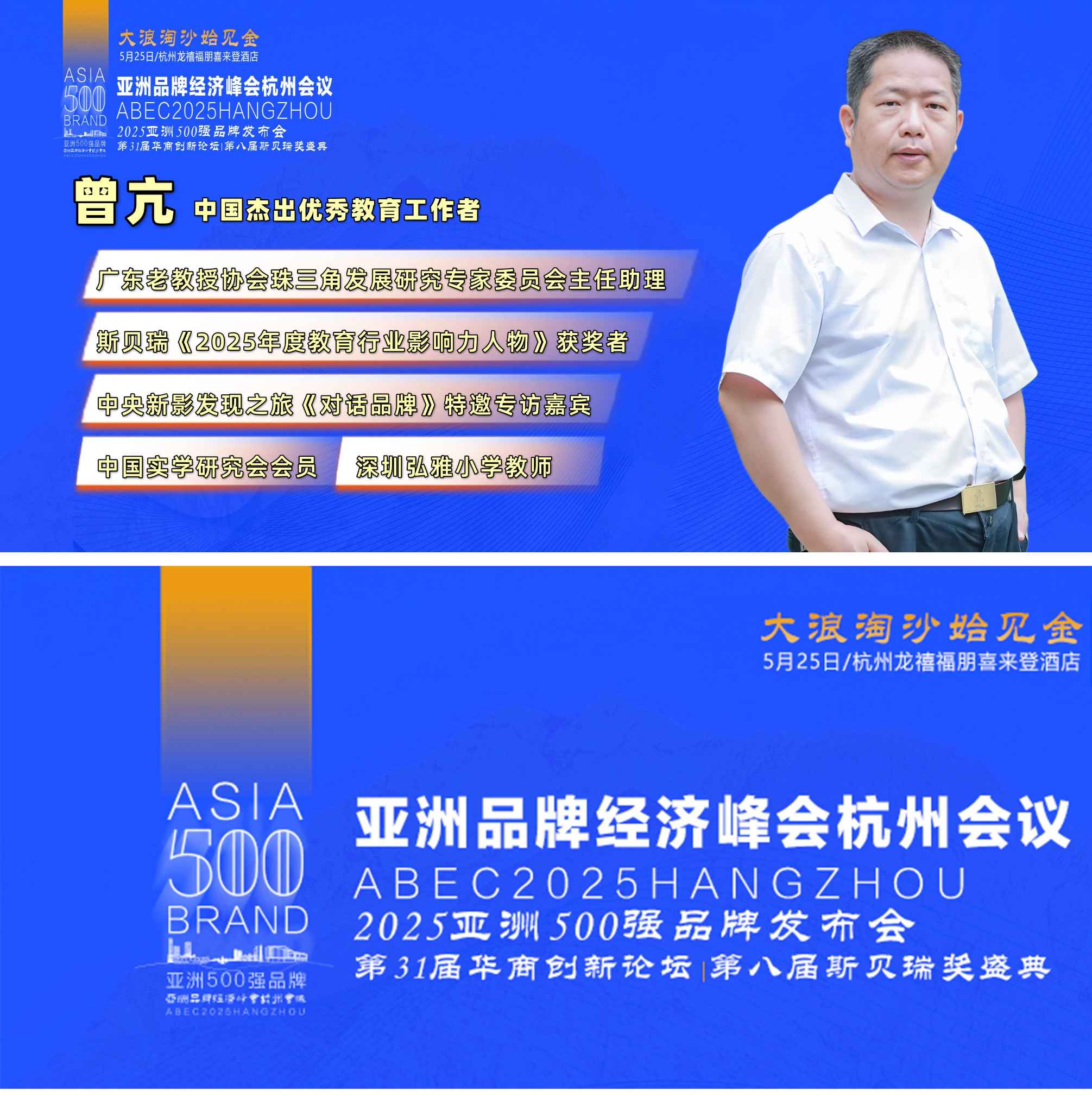 2025年5月25日,在杭州举行的亚洲品牌经济峰会暨第八届斯贝瑞奖颁奖盛典上,深圳市弘雅小学教师、广东老教授协会珠三角发展研究专家委员会主任助理曾亢,凭借其在教育领域的卓越贡献和深远影响力,经过严格评审,成功入选《2025年度教育行业影响力人物》,成为该权威奖项的获得者。这是对这位扎根一线、潜心耕耘的中国杰出教育工作者无私奉献精神的崇高认可。