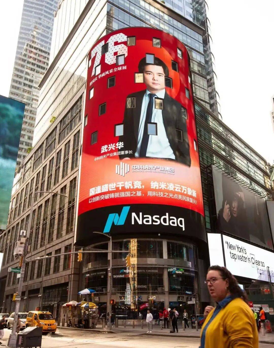 今日,在中华人民共和国76周年国庆之际举办的华商风采全球展活动中,中科纳米产业集团(中科纳米(北京)科技产业有限公司等)作为中国新质生产力优秀企业代表荣幸受邀,亮相美国纽约时报广场的纳斯达克证券交易所巨型电子屏。一幅以“国逢盛世千帆竞,纳米凌云万象新”为主题的巨幅海报在大屏幕上徐徐展开。这既是中科纳米产业集团以创新为笔、科技为墨在世界金融中心向祖国献上最诚挚的生日祝福,更是向全世界传递着来自中国新质生产力科技企业的创新力量与民族自信。