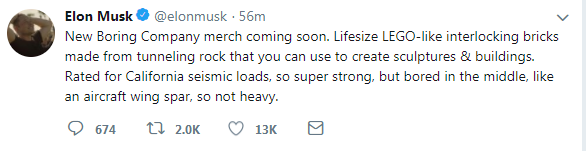 新浪科技讯 3月26日下午消息,今日中午,马斯克在Twitter上发文,宣布其Boring公司将推出新产品——一款用隧道石制作的类似乐高积木的联锁设备,你可以用它来制作雕塑和建筑。它能禁得住加州的地震,超级坚固,而且采用了中空设计,类似飞机的翼梁,重量却很轻。