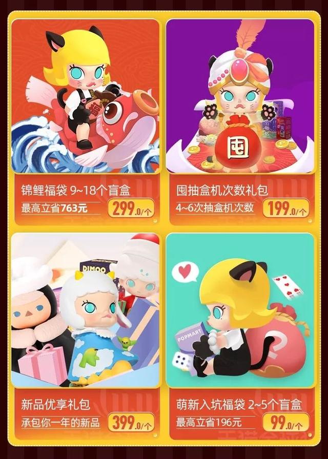 从种草到入坑的需求,则由售价299元、内含9-18个盲盒的“锦鲤福袋”满足。