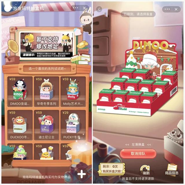 基于平台生态,泡泡玛特还衍生了一系列娱乐性玩法。今年6月,天猫旗舰店2.0上线,泡泡玛特的技术团队自研了购物小程序“在线抽盒机”,其旗舰店日销因此提升60%以上。双11期间,泡泡玛特推出了含有随机抽盒次数的福袋,以及收集碎片兑换抽盒次数的在线小游戏,前者刺激销量,后者则延长了用户每日在店铺的停留时间。