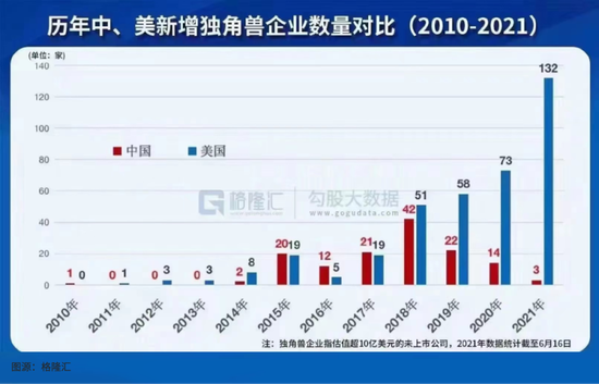 图中显示,在2015年—2017年,中国每年新增独角兽数量一度超越美国。此后被美国反超,并逐渐拉大差距,直至2021年出现悬殊的132∶3。