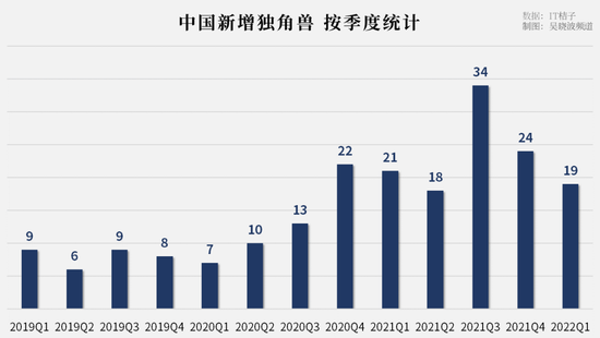 IT桔子数据显示,2021年中国市场上新增了97家独角兽公司,同比增加了86.5%。趋势延续到2022年,今年第一季度又新增19家独角兽公司。而这一成绩,在今年下半年恐怕难以为继。