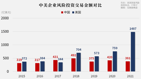 ② 2021年,无论是风投募资金额还是交易金额,中美差距明显。中国风投募集金额曾在2016年、2017年超越美国,而去年只有美国的28%;交易金额曾在2018年达到美国的88%,去年只有美国的三分之一。