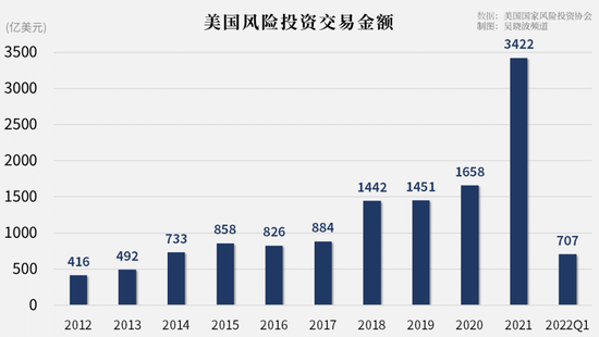 2021年,美国风险投资市场的交易规模达到了3422亿美元,创下新高。也就是说,在这一年里,风险投资机构向初创企业送出了3422亿美元的“钞能力”。