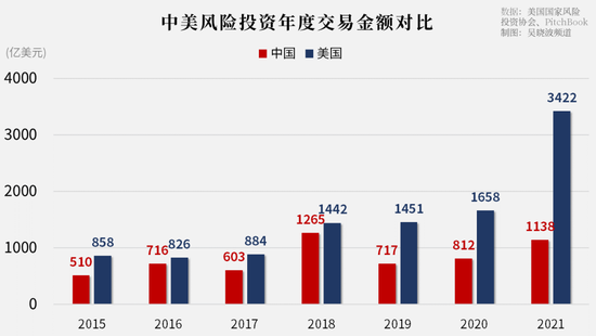 PitchBook数据显示,2018年,中国(含港澳台)风险投资交易金额为1265亿美元,达到历史顶点,相当于美国同期的88%。此后中国持续走低,2021年回升至1138亿美元,相当于美国同期的三分之一。
