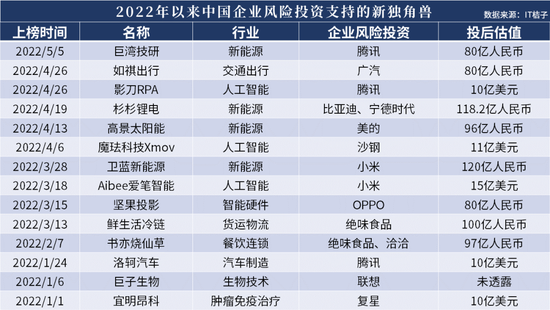 也正是这些大企业,2022年以来一直在与红杉等海外风险投资机构进行中国独角兽争夺战。IT桔子统计显示,截至2022年5月20日,中国新增了28家独角兽,14家在拿到中国企业风险投资部门的投资后晋升为独角兽。其中8家属于新能源等实体经济,3家是人工智能独角兽,2家是医药领域独角兽。