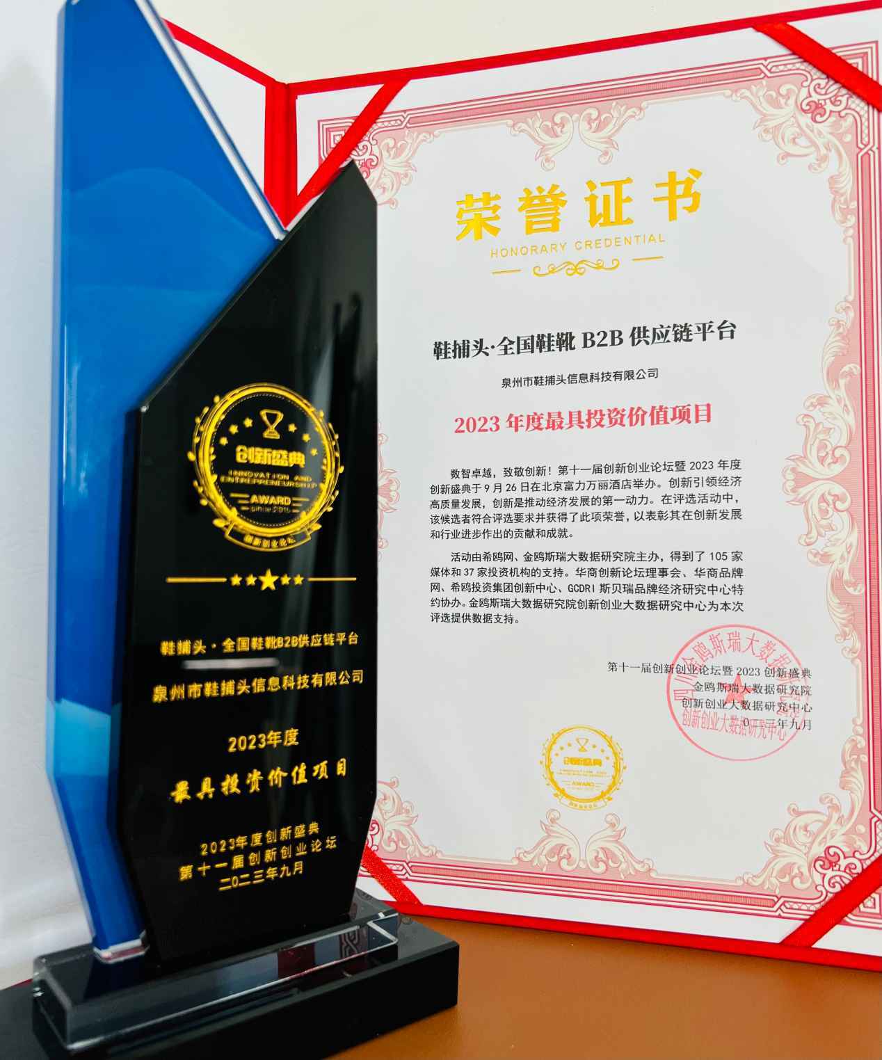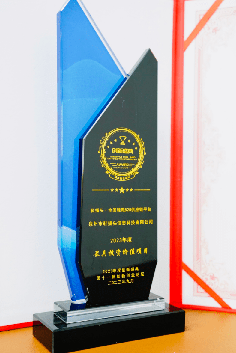 根据专业评委的评鉴和打分,凭借卓越的创新能力和行业影响力,在下午的活动上,活动特邀主持——新华社特约主持人渊博宣布泉州市鞋捕头信息科技有限公司项目“鞋捕头·全国鞋靴B2B供应链平台”获评第十一届创新创业论坛暨2023创新盛典年度最具投资价值项目奖项。