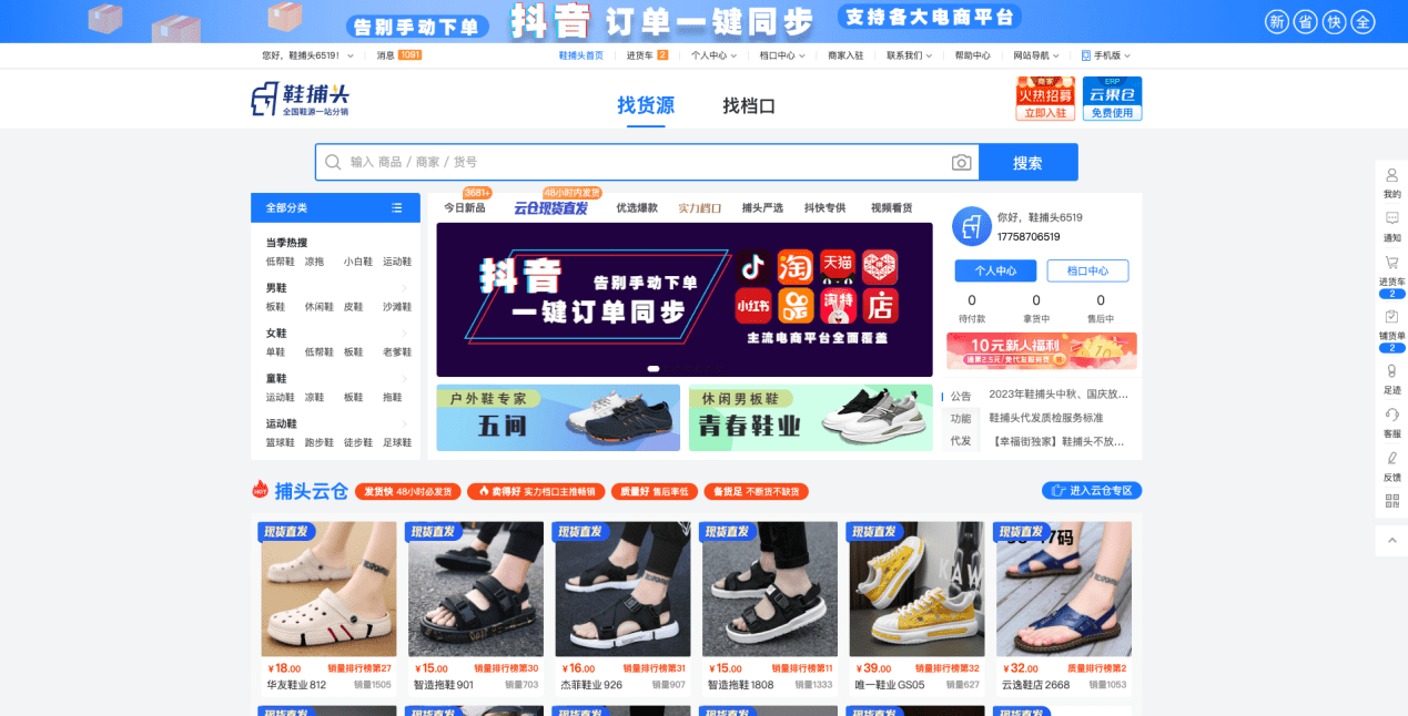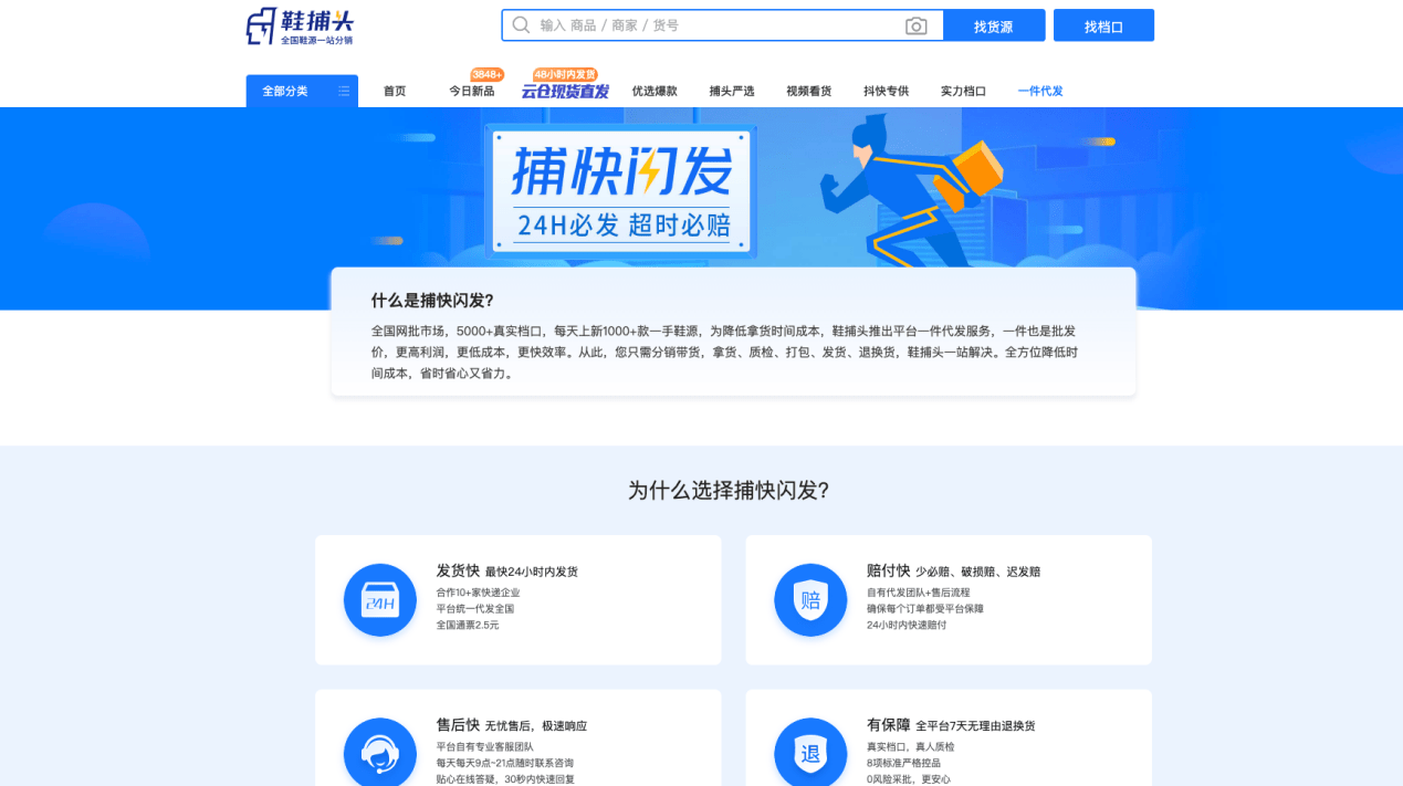 鞋捕头与国内主流电商平台淘宝、京东、拼多多、抖音、快手,国外跨境平台Shopee、Lazada、Amazon、Shein等API货源供应链对接,为平台供应商打开销售渠道,为采购商提供“全、新、快、省”的一手鞋源货源采购和一站式发货物流服务,双向赋能鞋靴供应商和采购商。鞋捕头于2022年5月6日正式上线PC官网、移动APP、微信小程序三大系统,在供货商端,已实现泉州幸福街、成都美博城、晋江鞋都商户的全面覆盖,平台档口数量超3000家,在采购商端,平台积累超5万全国中小电商卖家,其中活跃用户超过8000。在平台总商品数超过70万,品类包括男鞋、女鞋、童鞋等全部鞋靴类目。