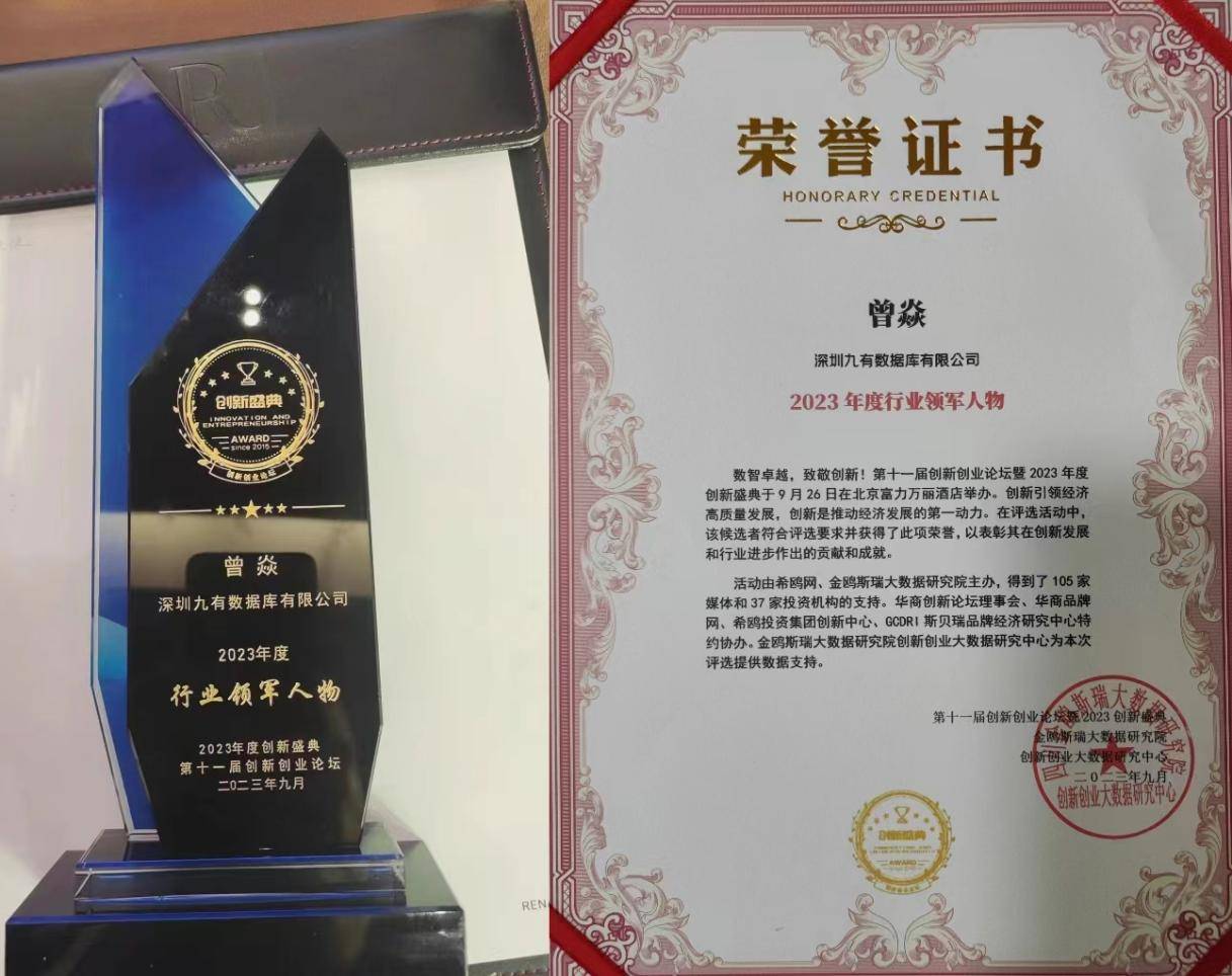 根据专业评委的评鉴和打分,凭借卓越的创新能力和行业影响力,在下午的活动上,活动特邀主持——新华社特约主持人渊博宣布深圳九有数据库有限公司曾焱先生获评第十一届创新创业论坛暨2023创新盛典年度行业领军人物奖项。