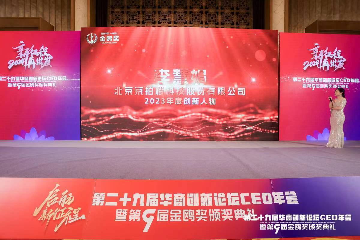 其中主持人宣布,京拍档获评第九届金鸥奖“2023年度行业领先奖”奖项。京拍档创始人李慧娟女士获评第九届金鸥奖“2023年度行业创新人物”奖项
