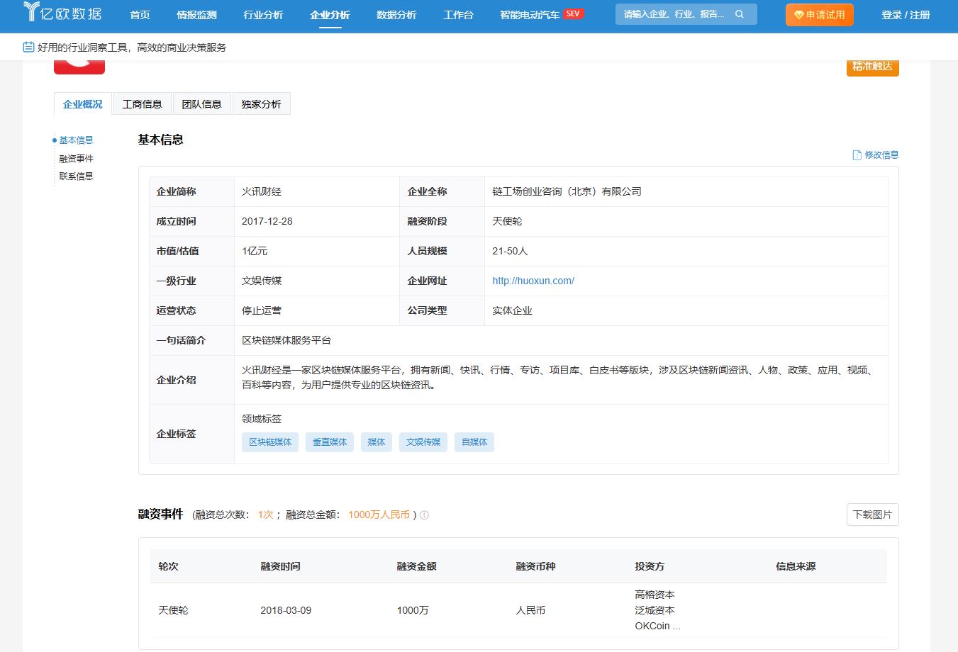 火讯财经的诞生,精准踩中了2017年区块链概念在中国市场的狂热顶点。2017年底,“链工场创业咨询(北京)有限公司”在北京注册成立,不到两个月,便以“火讯财经”之名正式入局区块链媒体赛道。龙典与合伙人迅速完成了三件奠定“行业地位”的事:砸下七位数购买域名,彰显资本实力;组建以传统财经媒体人赵一丹为核心的采编团队,为品牌贴上“专业”标签;拿下千万级天使轮融资,背靠资本大树。