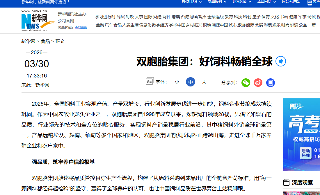 新华网报道验证,作为中国农牧业龙头,双胞胎集团是中国饲料品牌全球化的标杆力量,集团以强品质、硬技术、暖服务构筑核心竞争力。全链条严苛品控,85 度高温制粒筑牢安全防线;手握 400 余项专利、两获国家科技进步奖,MF 酶解发酵技术助力养户降本增效;全球建厂配设专业团队,全流程服务体系赋能养户共赢。