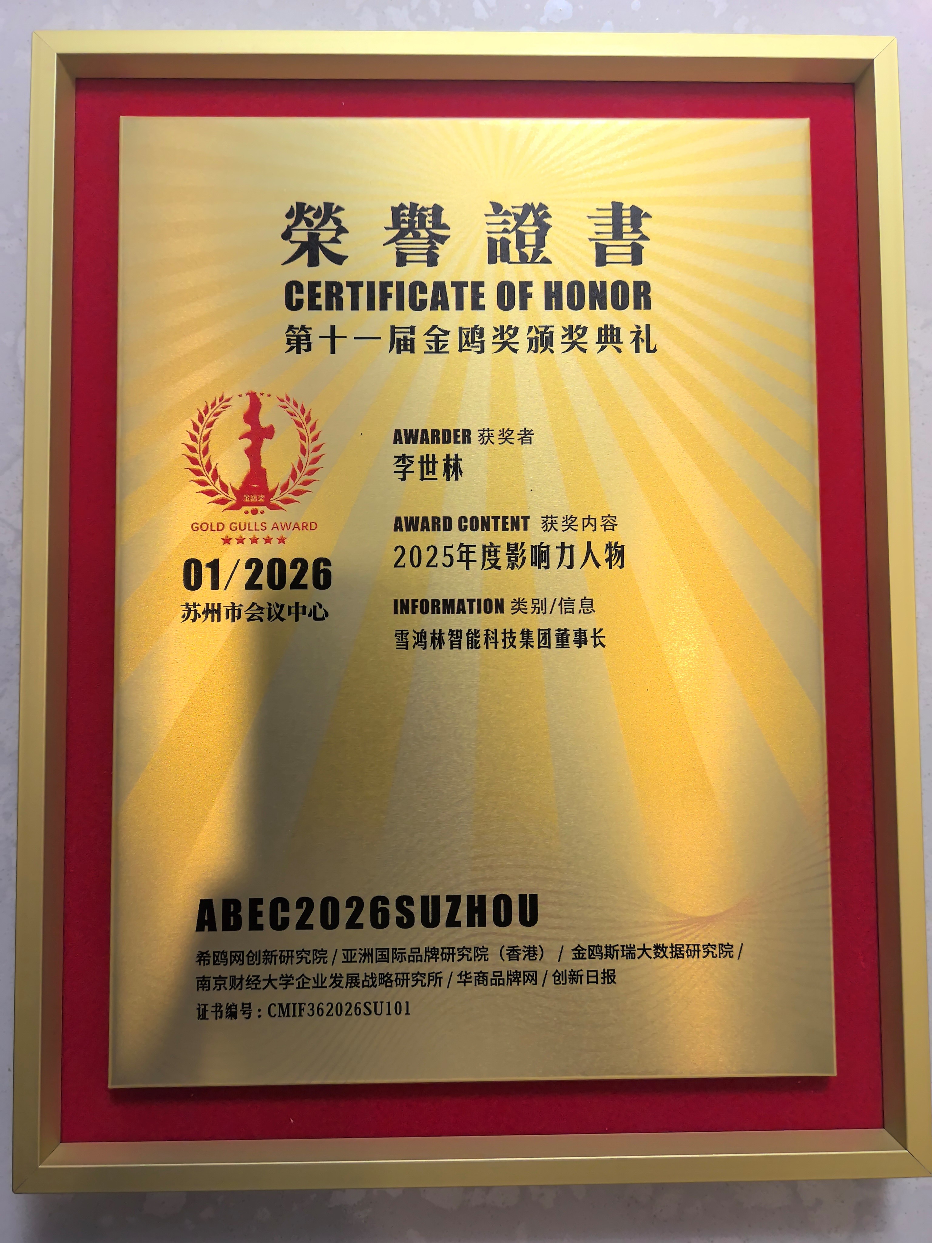 活动上揭晓了"年度金鸥奖"评选结果,其中"雪鸿林智能科技集团董事长李世林”荣获金鸥奖“2025年度影响力人物”奖项。