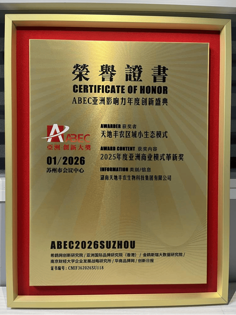 2026年1月11日,第 36 届华商创新论坛暨亚洲影响力年度创新盛典在江苏省苏州市会议中心举办,在亚洲影响力年度创新盛典上,湖南天地丰农生物科技集团有限公司“天地丰农区域小生态模式”荣获“2025年度亚洲商业模式革新奖”。