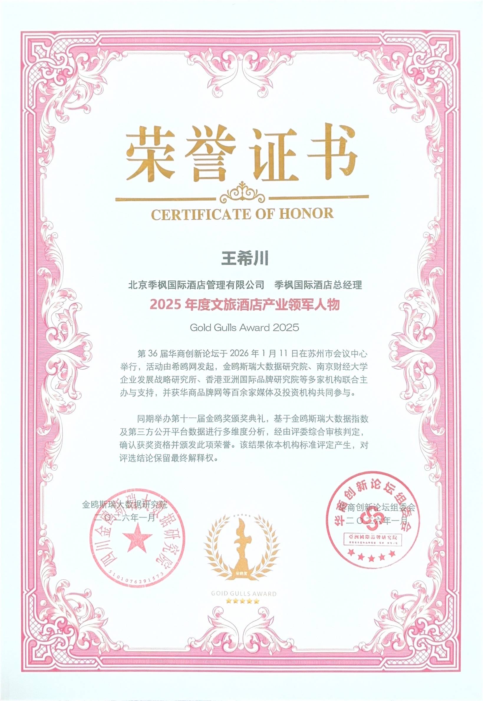 活动上揭晓了"年度金鸥奖"评选结果。其中北京季枫国际酒店管理有限公司 季枫国际酒店 总经理 王希川荣获金鸥奖2025年度文旅酒店产业领军人物。