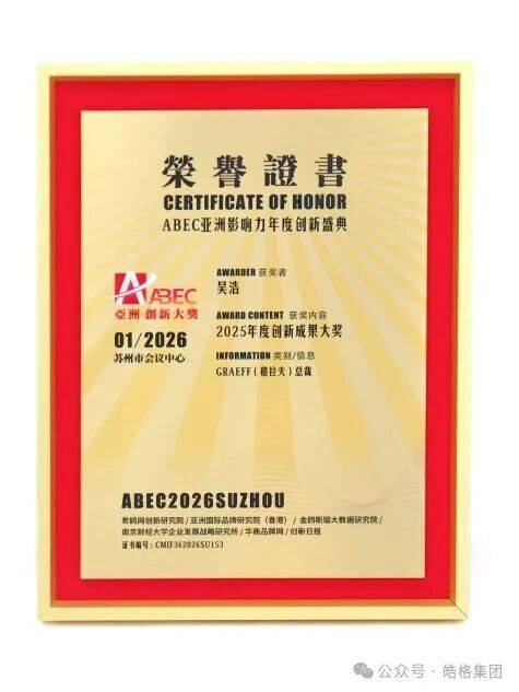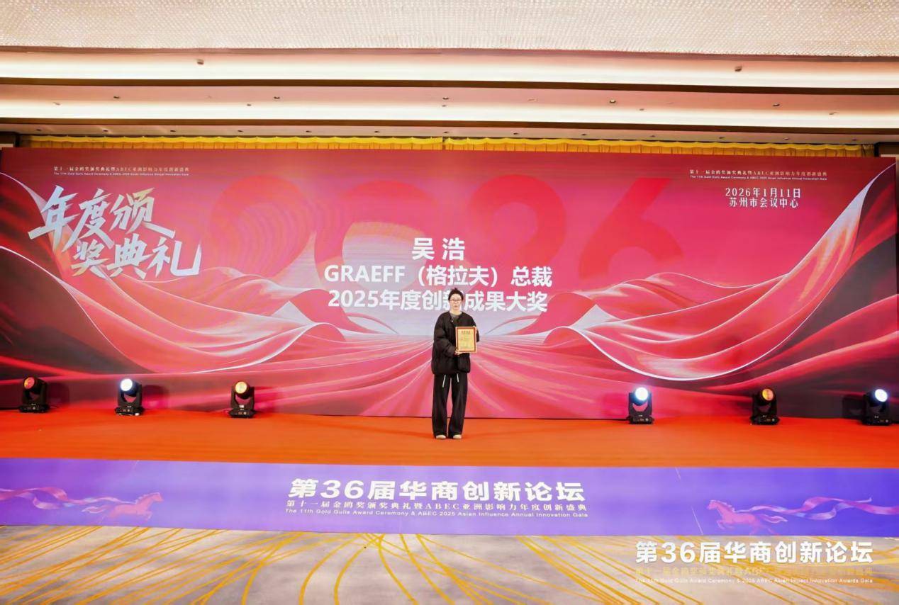 活动上揭晓了"ABEC亚洲影响力创新奖"评选结果,其中"吴浩 职务;GRAEFF(格拉夫)总裁"获得了"2025亚洲影响力创新盛典,创新成果大奖"。