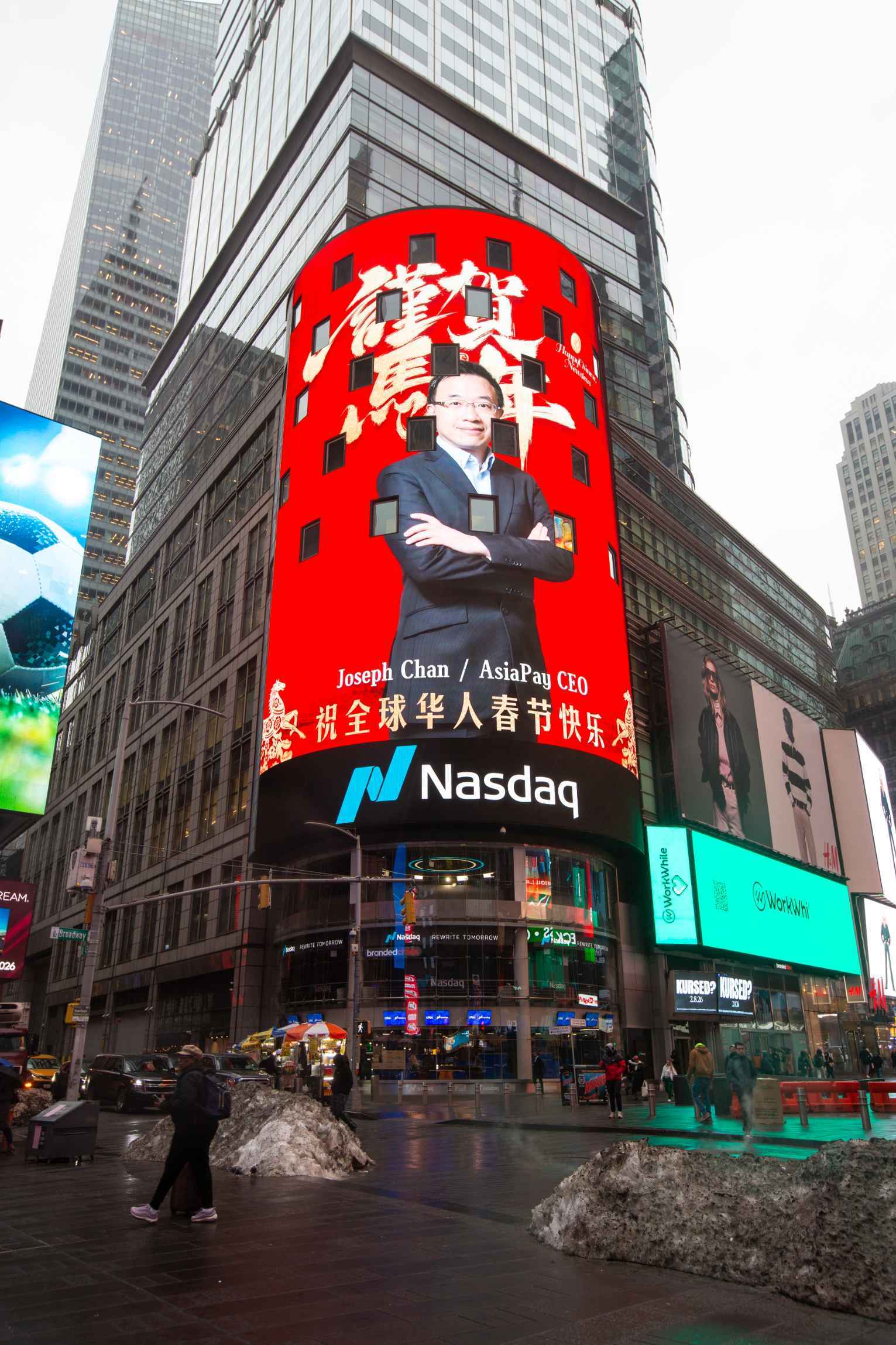 北京时间2026年2月16日凌晨(纽约当地时间2月15日下午3点),AsiaPay联款通首席执行官陈永祥先生,通过世界第一屏(美国纳斯达克大屏)向全球华人送上了诚挚的农历马年新春祝福,向世界人民展示亚洲数字电子支付品牌参与全球品牌竞争的信心和决心。